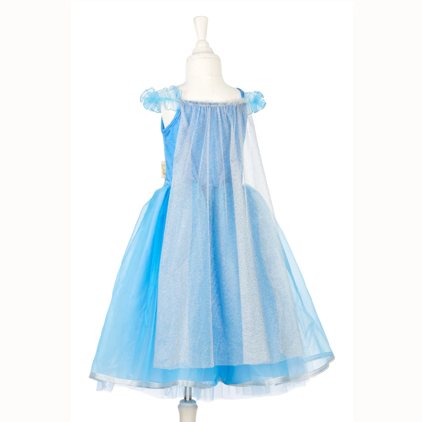 The fitted bodice has a panel of sparkly silver fabric at the front and the neckline and shoulders have a fabulous net frill. The neckline is also embellished with sparkly pom-poms and at the back is a lovely flowing cape.